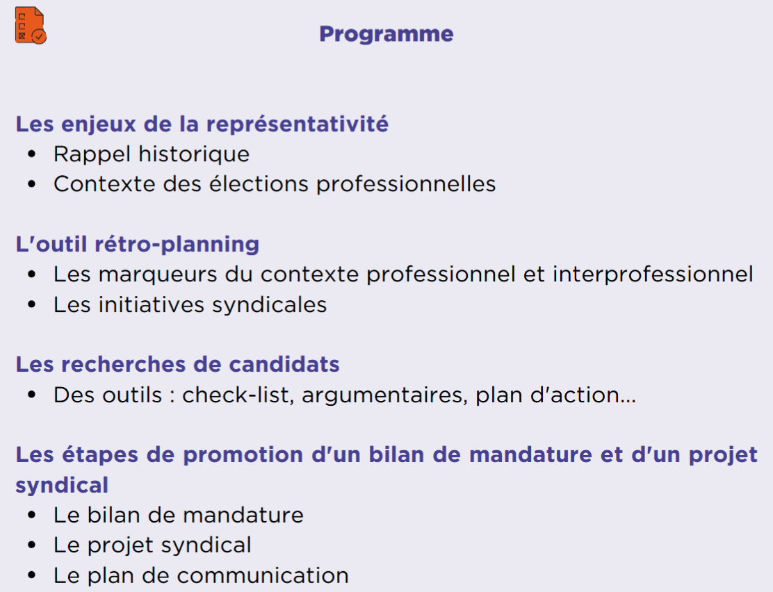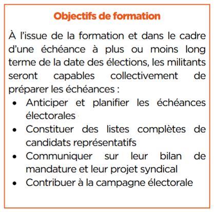 Bonjour, le 5 décembre lors de son assemblée des sections, le syndicat a lancé la campagne des élections professionnelles 2026. Dès lors, nous vous recommandons vivement la formation "préparer et gagner les élections" : que vous soyez du secteur privé ou public, c'est une journée à vivre en équipe. Organisez-vous et venez à plusieurs de votre collectif. Inscrivez-vous vite (Rappelez-vous, il faut prévenir votre employeur un mois à l'avance) !